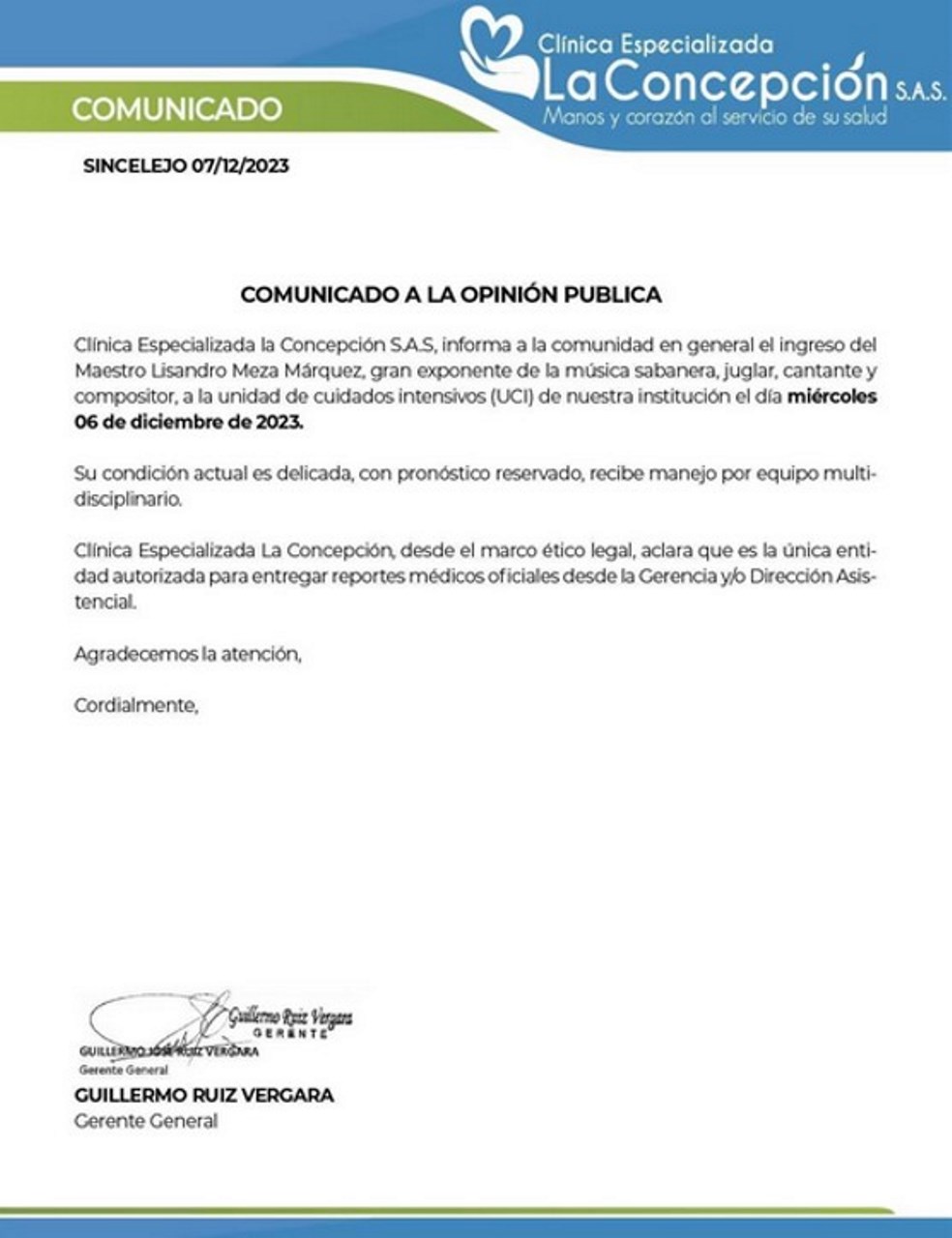COMUNICADO DE LA CLINICA CONCEPCION SOBRE LISANDRO DIAZ