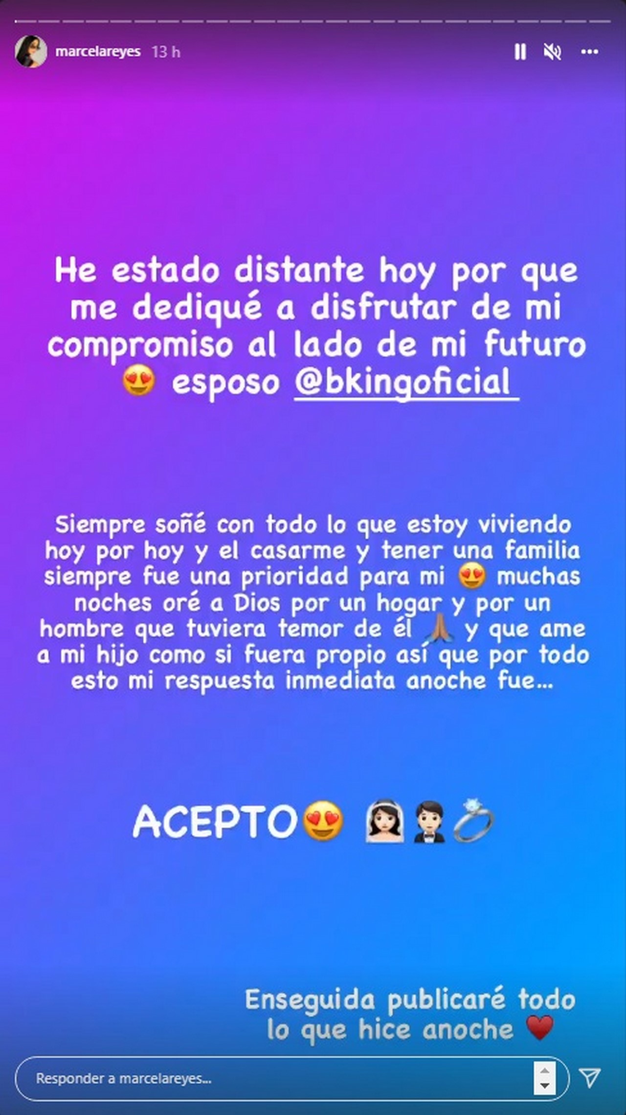 “Sin temor a equivocarme, mi amor. Oye, ¿te quieres casar conmigo? Perdón la presentación, se me quedó la cajita en el hotel. Marcela, ¿tú quieres ser mi esposa?”, dijo B King.