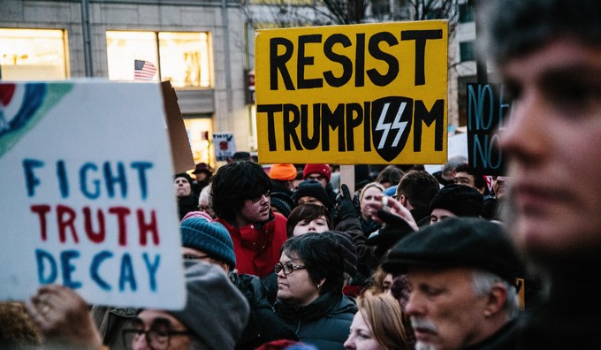 EPA1175. NUEVA YORK (ESTADOS UNIDOS), 18/02/2019.- Personas protestan contra el presidente de los Estados unidos, Donald J. Trump, este lunes en Nueva York, Nueva York (EE. UU.). El grupo activista Move On organizó este lunes varias protestas en diversas ciudades de Estados Unidos en contra de la declaración de emergencia nacional con la que el presidente Donald Trump busca reunir fondos para construir el muro en la frontera con México, sin el visto bueno del Congreso. EFE/ Alba Vigaray