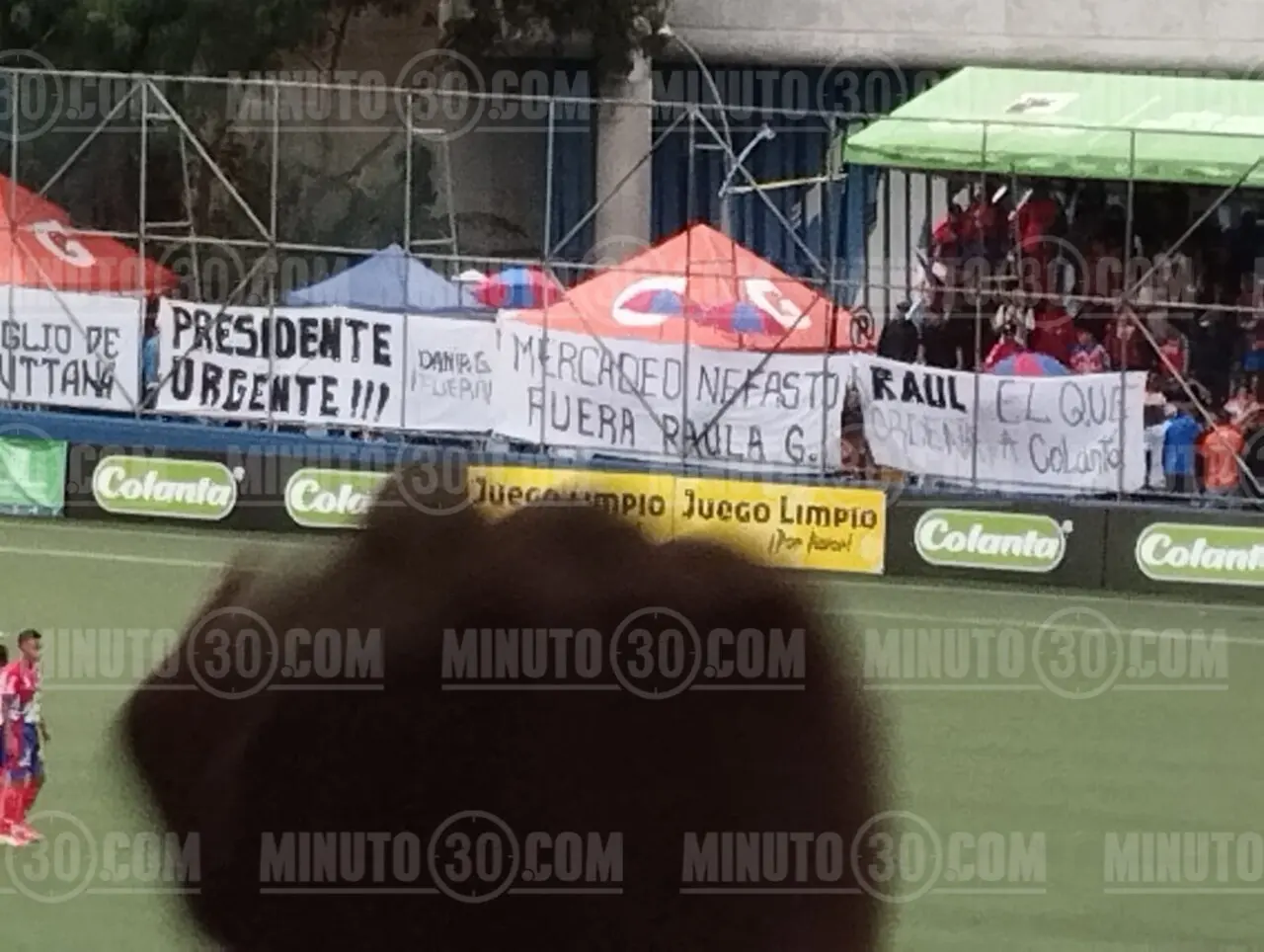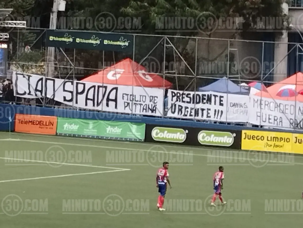 Hasta que no fueron descolgados los tapos con los que protestaban hinchas del DIM, no se continuó con el partido del BabyFutbol. Foto: Minuto30.com