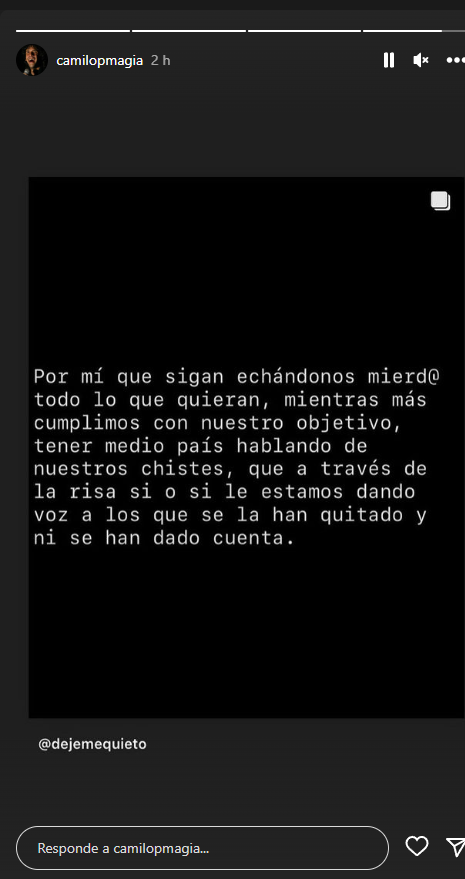 En una de sus historias de Instagram, también publicó el siguiente texto: “por mi que sigan echándonos mierd@ todo lo que quieran, mientras más cumplimos con nuestro objetivo, tener medio país hablando de nuestros chistes, que a través de la risa si o si le estamos dando voz a los que se la han quitado y ni se han dado cuenta”.