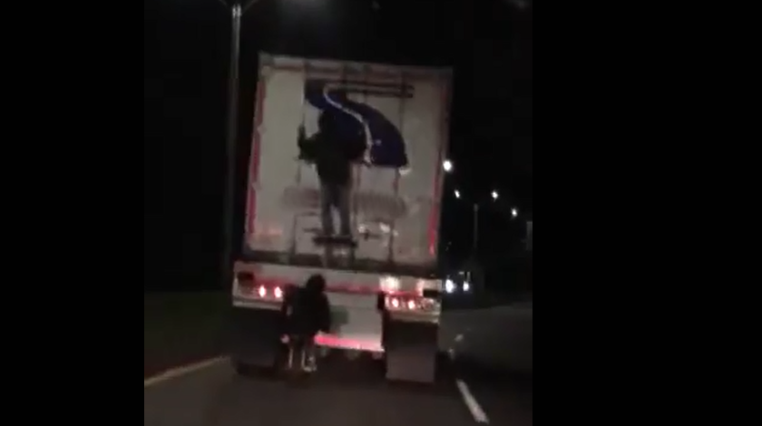 Ciudadanos registraron en video el momento en el que un par de jóvenes arriesgan su propia vida al ir ‘colgados’ de una vehículo de carga.