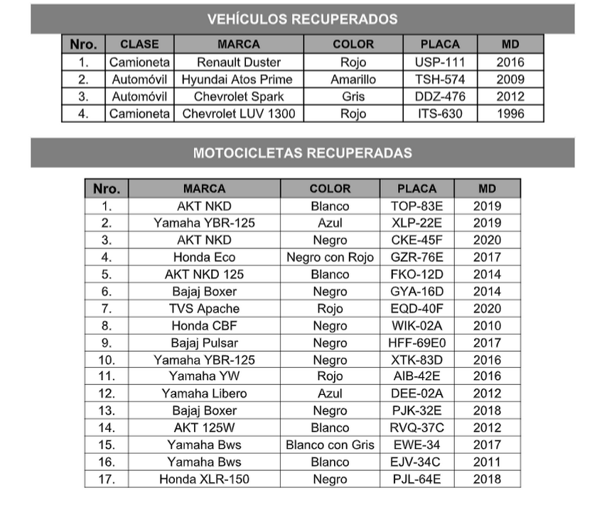 En las acciones y operaciones en contra el hurto en el territorio del Valle de Aburrá, fueron recuperadas 17 motocicletas y 4 carros. Las autoridades dieron a conocer las placas de estos vehículos.