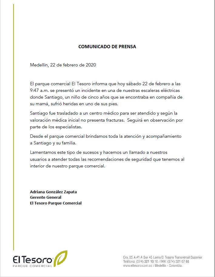 En horas de la mañana de este sábado 22 de febrero se presentó un incidente al interior de un centro comercial de Medellín que dejó a un pequeño de 5 años de edad herido.