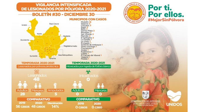 Así las cosas, Antioquia acumula a la fecha 48 lesionados por pólvora, de los que 28 son adultos y 20 menores de edad.