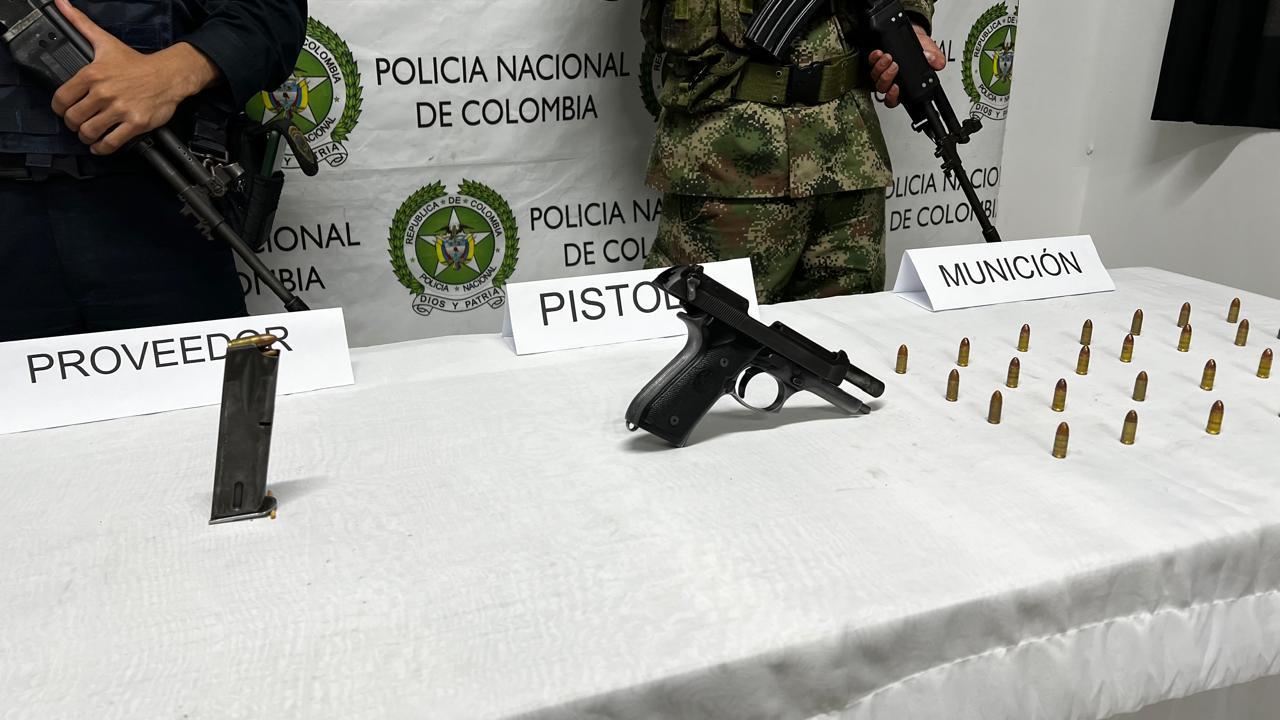 El capturado fue identificado como Ferney Atehortúa García, alias “fercho” de 34 años de edad, quien tenía en su poder un arma de fuego Pietro Beretta con munición y cuatro cartuchos percutidos, y un cordón verde atado.