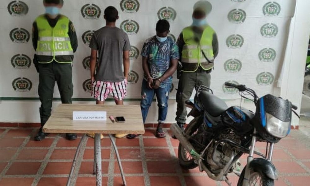 La captura la lograron gracias al llamado oportuno de la ciudadanía a la línea de emergencia 123, que permitió en una rápida reacción por las patrullas interceptar a los sujetos, los cuales se movilizaban en una motocicleta bóxer color negra, después de haber despojado a una joven de su celular en el barrio La Esmeralda mediante intimidación con elemento cortopunzante.