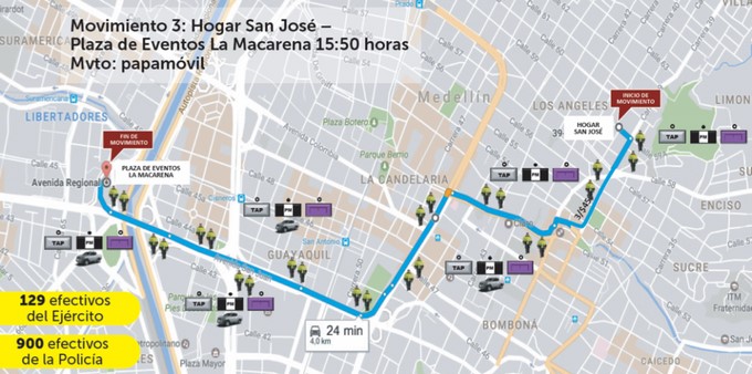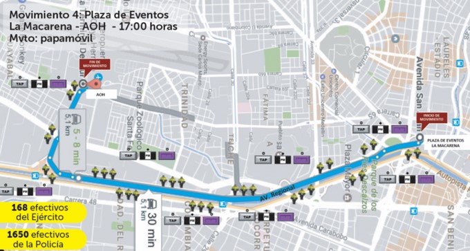 Se tiene previsto que el Papa Francisco realice dos recorridos en el papamóvil, el primero, hacia las 3:30 p.m., en el trayecto del Hogar San José hasta el centro de espectáculos La Macarena.