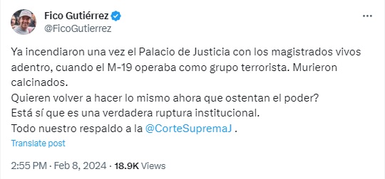 “Ya incendiaron una vez el Palacio de Justicia con los magistrados vivos adentro, cuando el M-19 operaba como grupo terrorista. Murieron calcinados”, escribió el alcalde de la capital antioqueña en su cuenta de X.