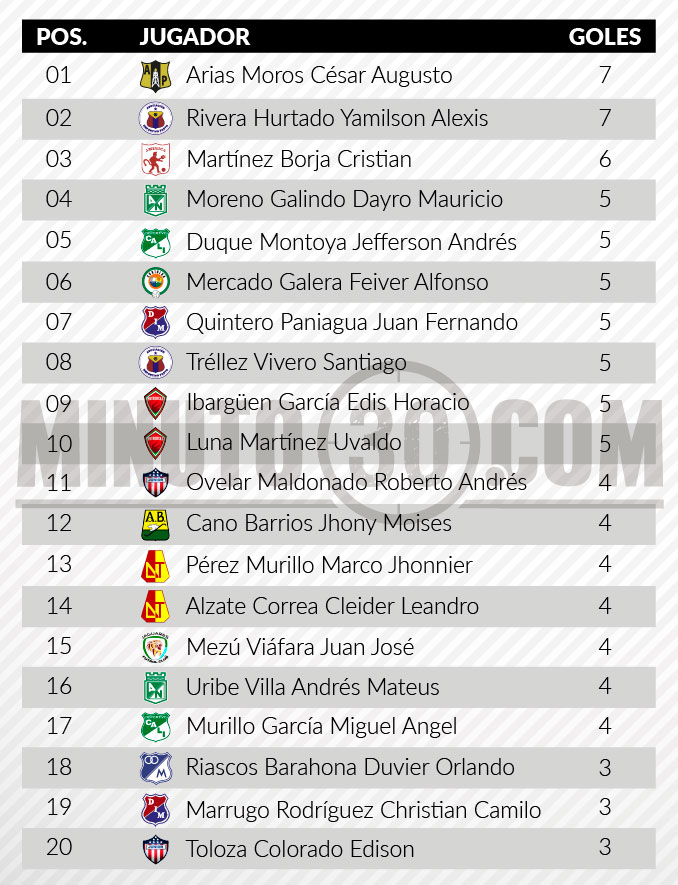 También entró en la puja el integrante del América, Cristian Martínez Borja, quien con su activa participación en la victoria de su equipo 4-2 ante Once Caldas, ajustó 6 anotaciones.