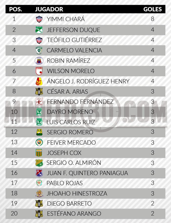 Tras sus anotaciones del fin de semana anterior ante Alianza Petrolera, Moreno y Ruiz quedaron a un gol de igualar a Yefferson Duque, quien aparece segundo con cuatro dianas, junto con cinco jugadores más.