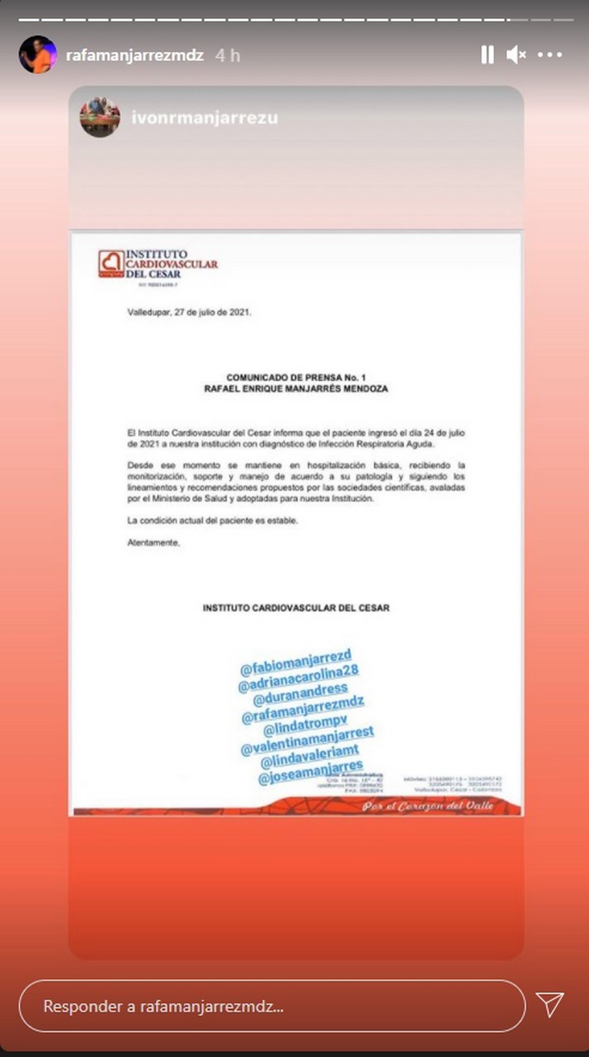 Según un comunicado emitido por el centro médico en la mañana de este martes, el artista “se mantiene en hospitalización básica, recibiendo la monitorización, soporte y manejo de acuerdo a su patología y siguiendo los lineamientos y recomendaciones propuestos por las sociedades científicas, avaladas por el Ministerio de Salud y adoptadas por nuestra institución”.