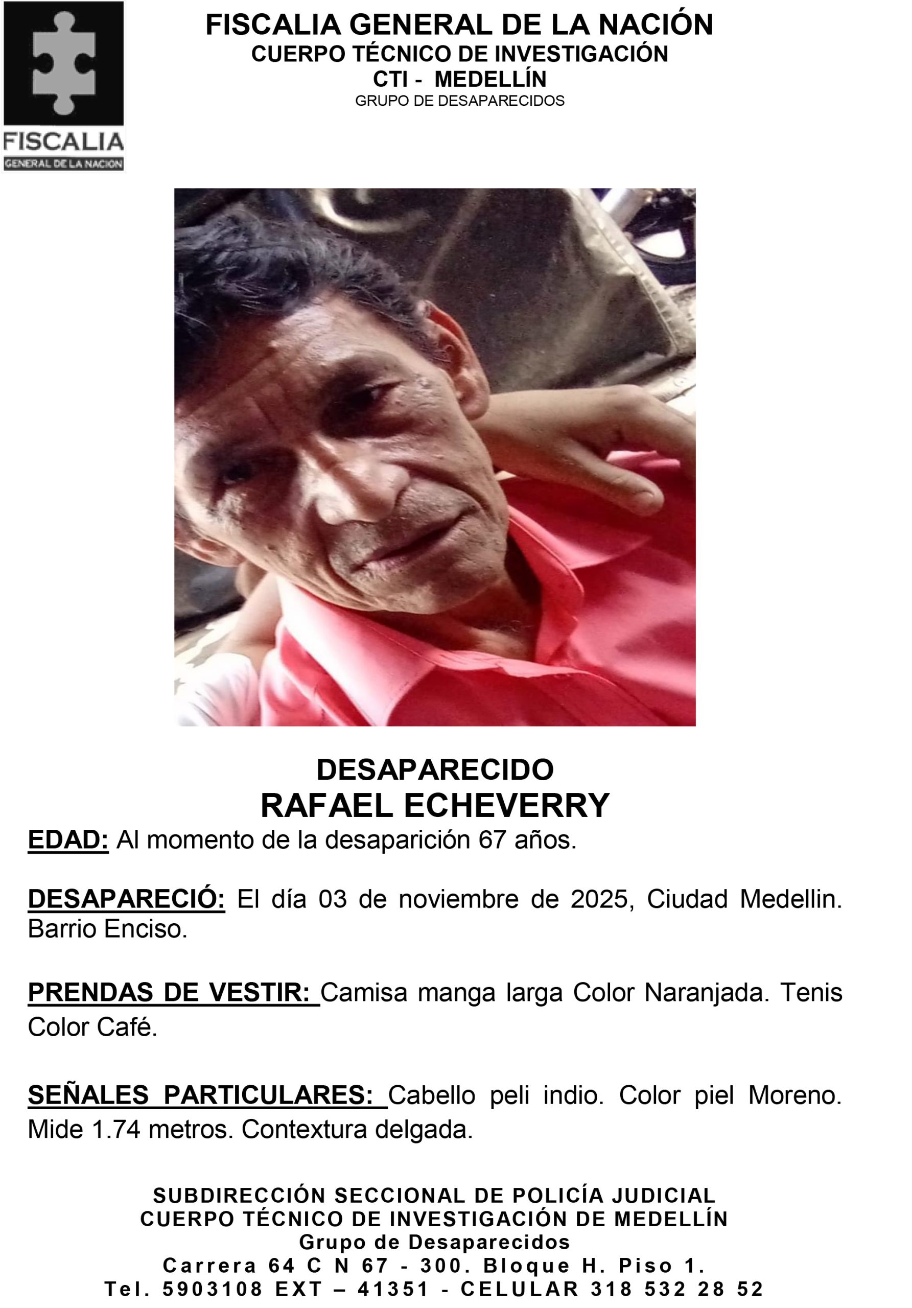 Resumen: Rafael Echeverry, de 67 años, fue reportado como desaparecido el 3 de noviembre de 2025 en la ciudad de Medellín, específicamente en el barrio Enciso.