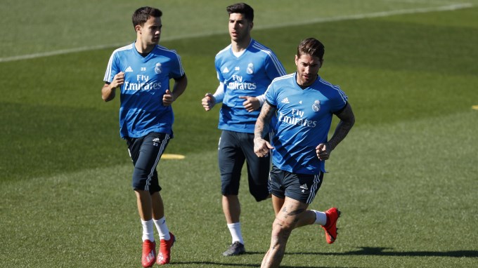 Los jugadores del Real Madrid Sergio Reguilón, Marco Asensio y Sergio Ramos durante el entrenamiento realizado este martes en la Ciudad Deportiva de Valdebebas para preparar el partido de vuelta de las semifinales de la Copa del Rey que disputa ante el FC Barcelona mañana en el estadio Santiago Bernabéu. EFE
