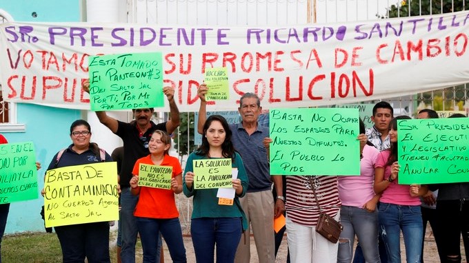 Con pancartas con frases como “Basta de contaminación. No a los cuerpos ajenos”, los manifestantes piden que no se ocupen los espacios que se han negado a los habitantes de El Salto para inhumar a sus familiares.