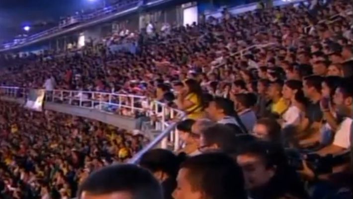 En el video se puede escuchar como, en el momento que se pronuncia “Gracias al presidente Santos”, la rechifla es tal que no se puede continuar con la lectura hasta pasados casi medio minuto.