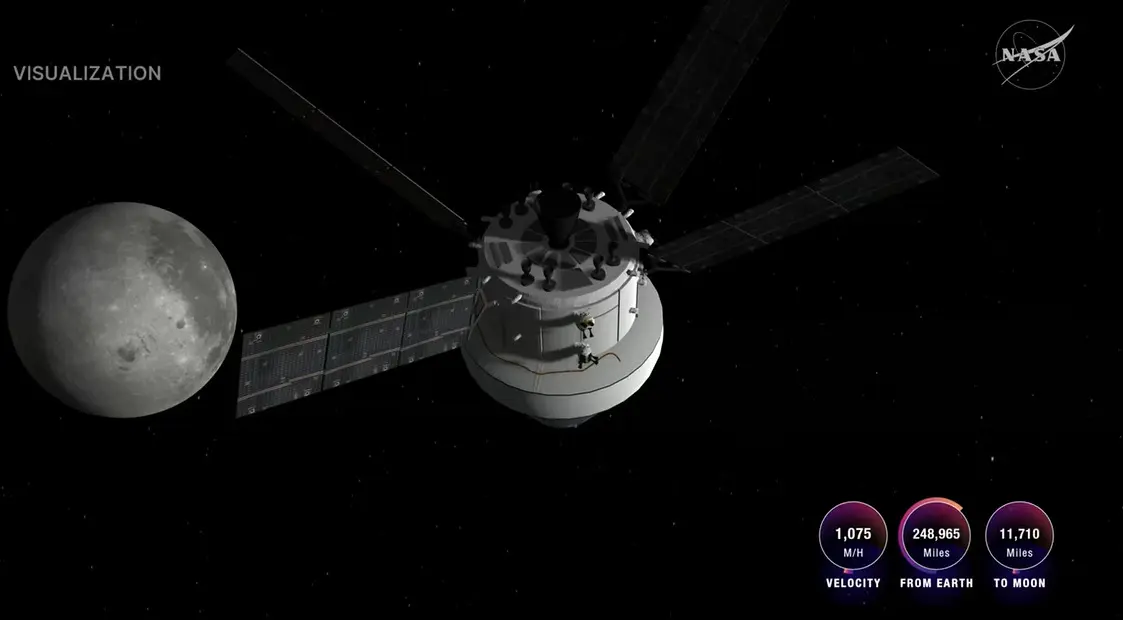 En este preciso instante, la cápsula Orion se encuentra en una órbita retrógrada distante, marcando las siguientes distancias asombrosas: