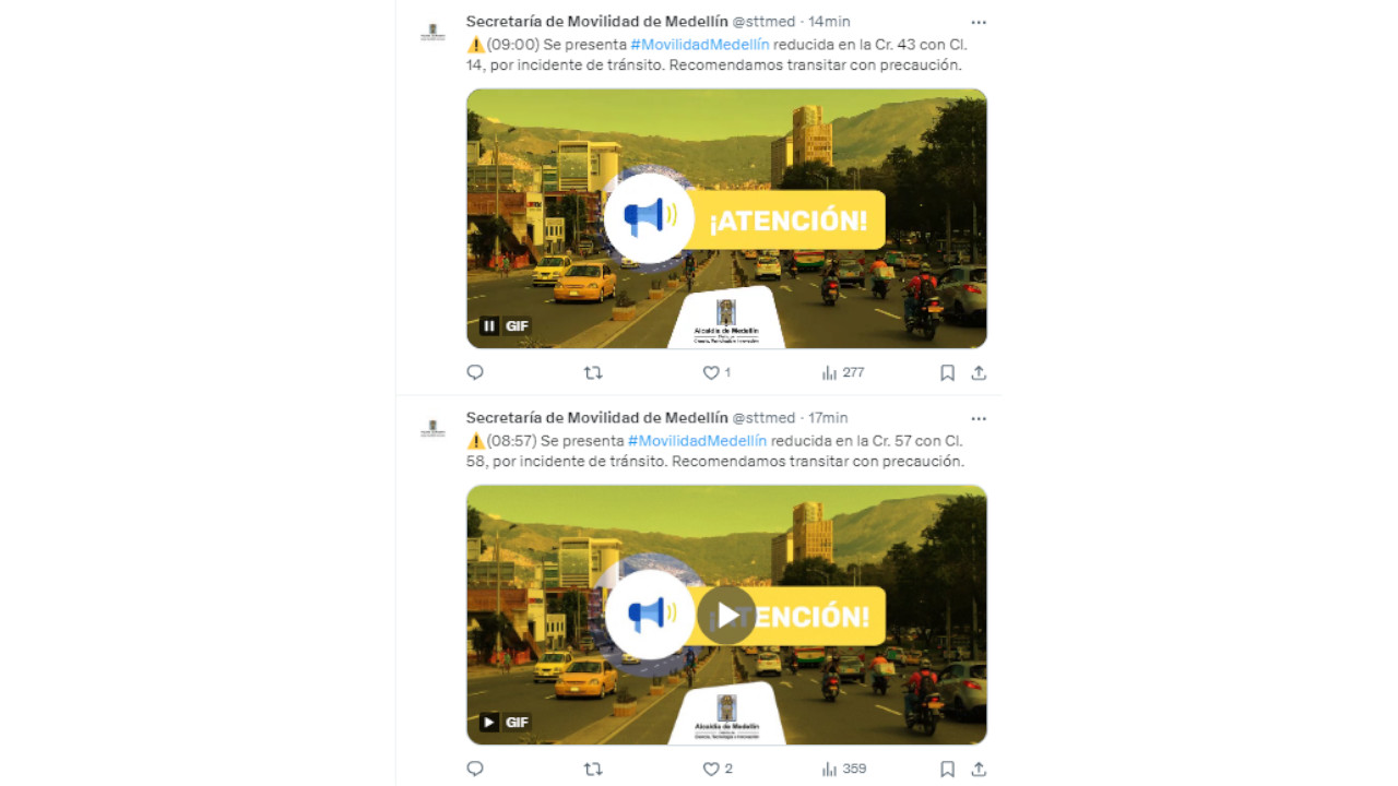 La secretaría de movilidad de Medellín no ha anunciado bloqueos por manifestaciones en la ciudad. Sin embargo, reportan incidente de tránsito que han afectado la movilidad.