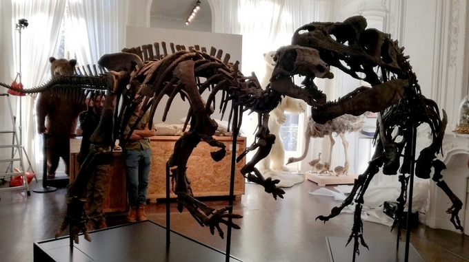 Presentados al público como si se tratara de una escena de combate, los esqueletos de dos dinosaurios adversarios, un Allosaurus y un Camptosaurus, se exponen hasta el día 19 de noviembre en la casa de subastas Artcurial de París antes de sacarlos a la puja.