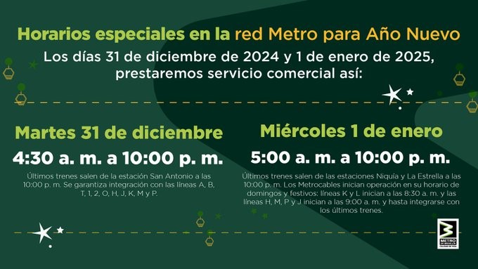 Minuto30.com .- El Metro de Medellín ha informado a través de sus redes sociales sobre los horarios especiales para los próximos días de fin de año, con el objetivo de que los viajeros puedan planificar su trayecto y llegar a tiempo para celebrar con sus seres queridos. La empresa destacó la importancia de organizarse adecuadamente para poder abrazar a mamá, familiares y amigos durante las festividades de Año Nuevo.