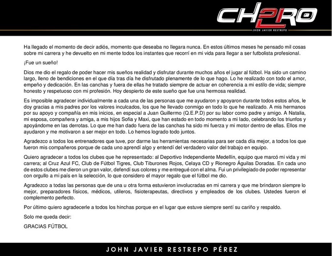 “Muchas gracias por ser uno de los ejemplos más grandes de profesionalismo, entrega y pasión que el fútbol nos ha regalado”, agrega la publicación del equipo del Oriente antioqueño.