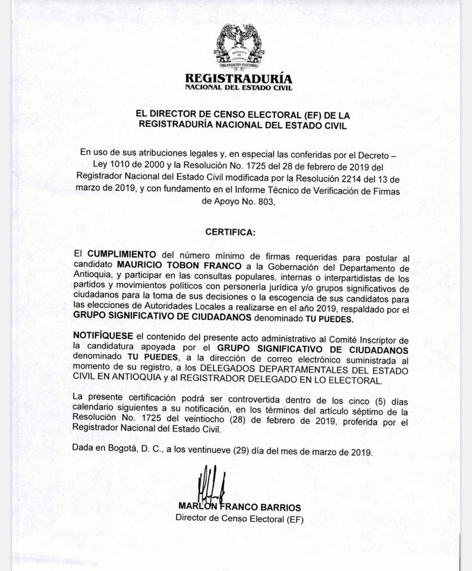 Además, la entidad certificó el movimiento Tu Puedes como un aspirante más a las próximas elecciones que se realizarán el próximo mes de octubre. Por medio de un documento, la institución explico que la Registraduría certifica “el cumplimiento del número mínimo de firmas requeridas para postular al candidato Mauricio Tobón Franco a la Gobernación del departamento de Antioquia, y participar en las consultas populares, internas o interpartidistas de los partidos y movimientos políticos con personería jurídica y/o grupos significativos para la toma de sus decisiones”.
