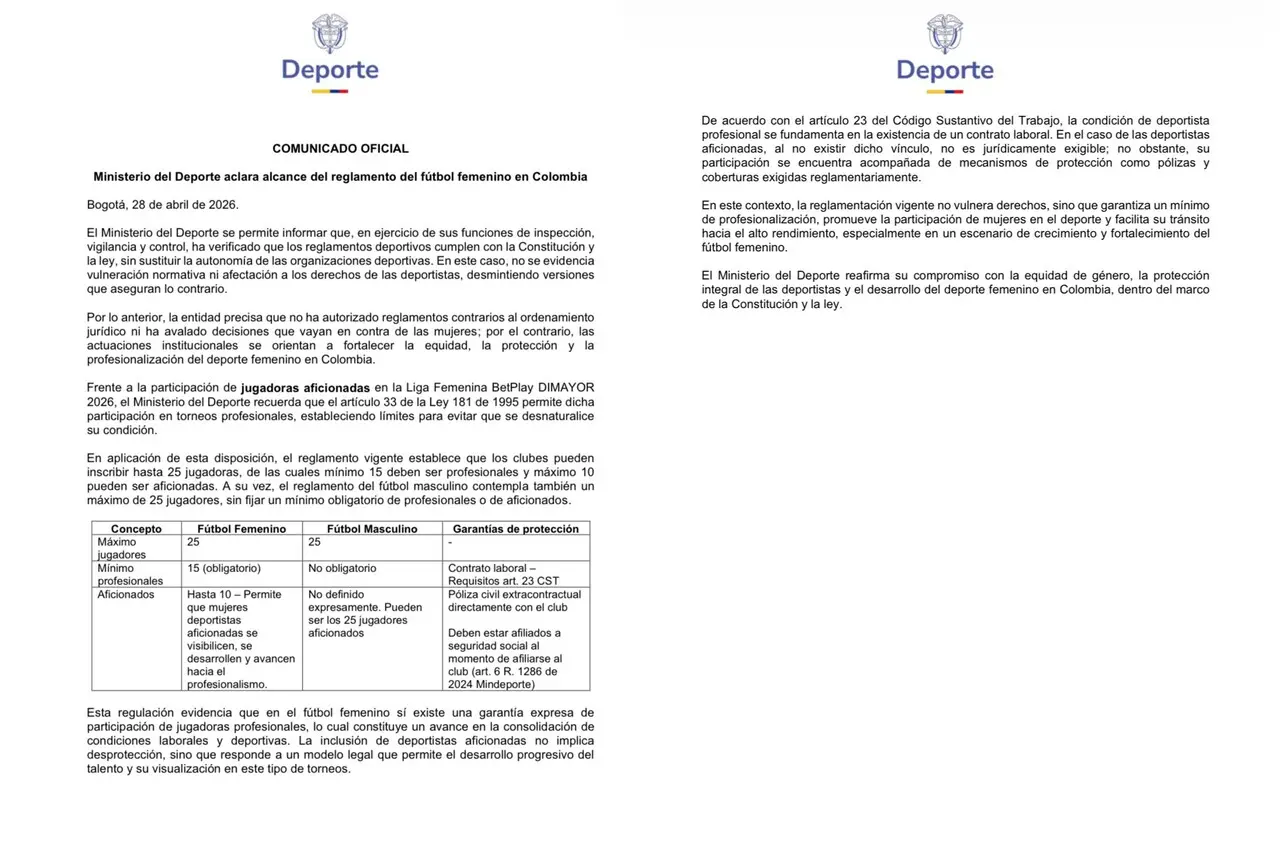 Minuto30.com .- Ante las recientes críticas y versiones que circulaban sobre supuestas irregularidades laborales en la Liga Femenina BetPlay DIMAYOR 2026, el Ministerio del Deporte emitió un comunicado oficial este martes para poner fin a la controversia.