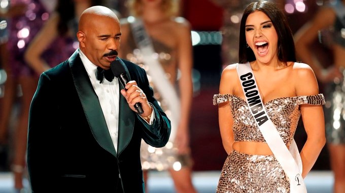 En la imagen, el presentador de Miss Universos, Steve Harvey (i), junto a la virreinal universal, Laura González (d), de Colombia. EFE/Archivo