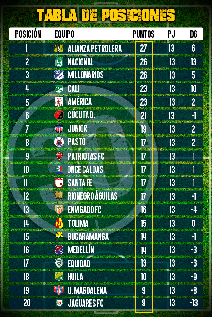 La tabla de posiciones contínua comandada por Alianza Petrolera, que a pesar de su derrota se mantiene por ahora sólido en el primer lugar, con 27 puntos.