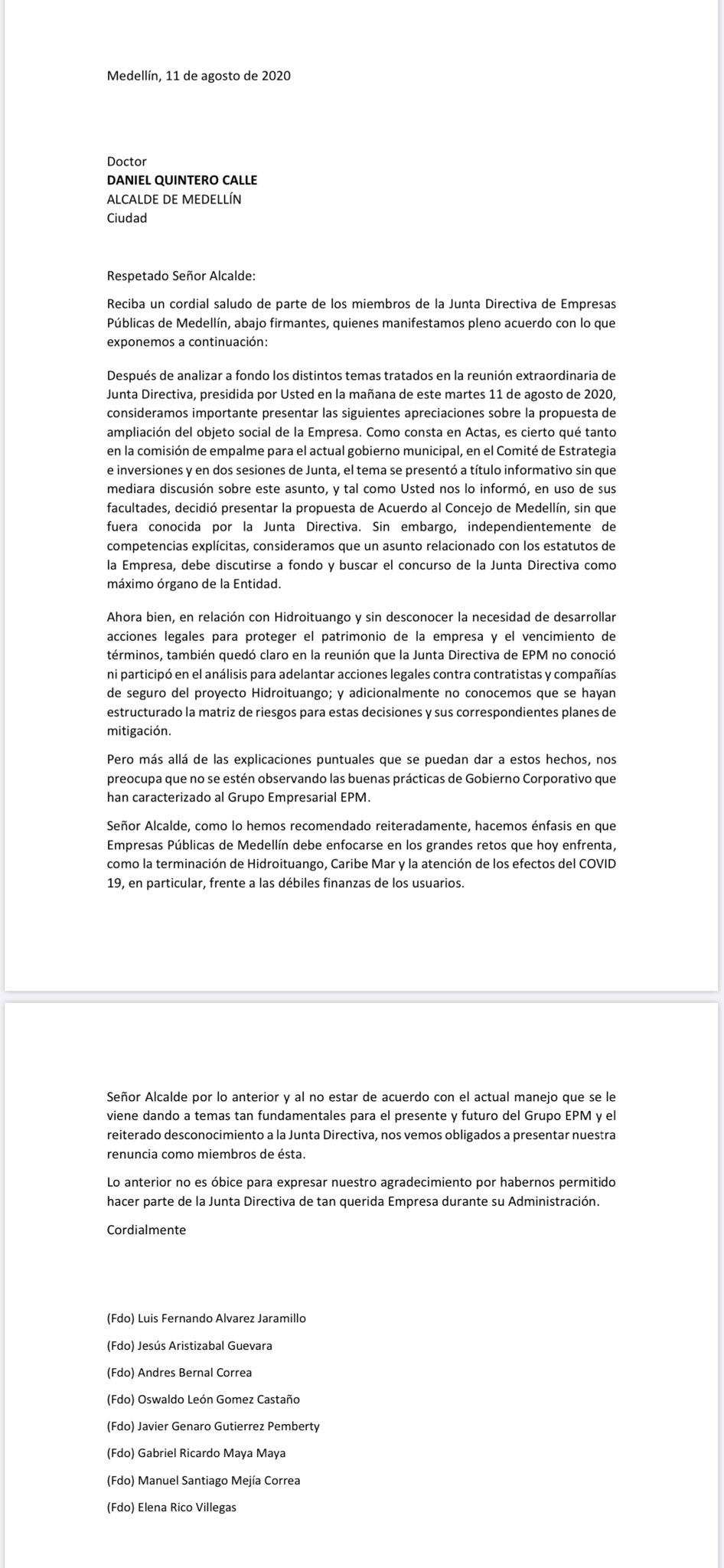 Tras las réplicas que ha traído el anuncio que Daniel Quintero hizo apenas el lunes 10 de agosto, se conoció este martes que ocho miembros de la Junta Directiva de EPM renunciaron.