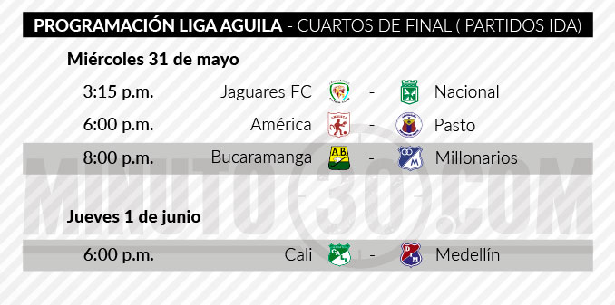 La programación de cuartos se abrirá con el partido entre Jaguares y Atlético Nacional, que se disputará este miércoles a partir de las 3:15 de la tarde en el estadio Jaraguay de Montería.