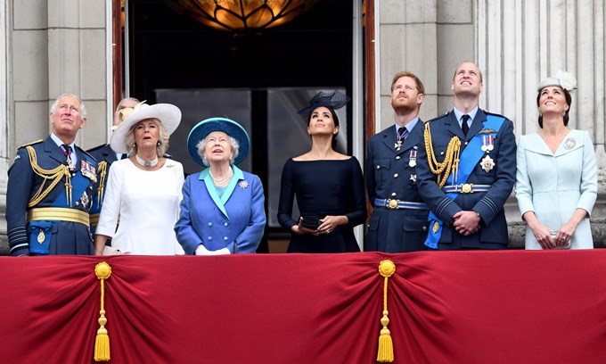 (De izq a dcha) El príncipe Carlos de Inglaterra, su mujer, la duquesa Camila de Cornualles, la reina Isabel II, los duques de Sussex Meghan y el príncipe Enrique, y los duques de Cambridge Guillermo y Catalina