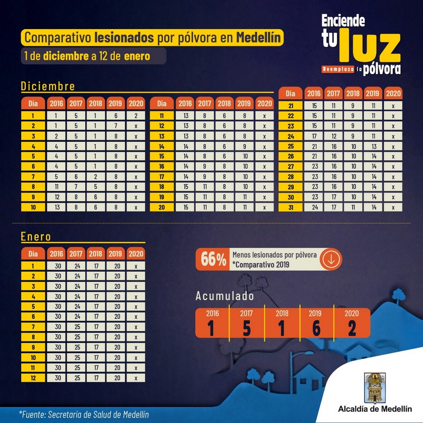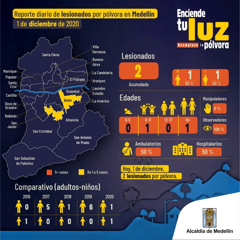 Con respecto al año 2019, para este 1 de diciembre de 2020 hubo un 66% menos lesionados por pólvora -lo cual es tendencia a la baja- teniendo en cuenta que para ese día se presentaron seis lesionados el año pasado.