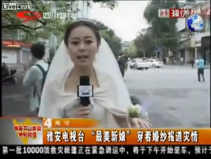Chen Ying, una presentadora de televisión de un canal chino, tuvo la cobertura de su vida justo en el momento que se iba a casar. Sorprendida por el terremoto de 6,6 grados del sábado, la joven no dudó en ponerse en contacto con su equipo de trabajo y reportear.