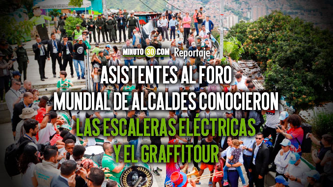 Los alcaldes y líderes que participan en la Cumbre Mundial de Ciudades recorrieron este jueves uno de los referentes de transformación urbana y social de Medellín: las escaleras eléctricas y el graffitour de la comuna 13.