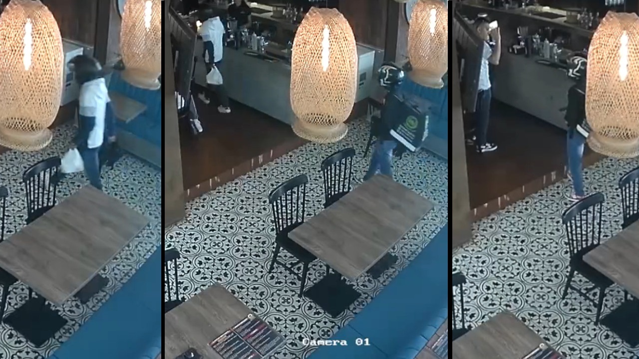 Uno de los ladrones lleva un maletero de domicilios, al parecer, lo llevan para evitar los controles de las autoridades y hacerse pasar por repartidor de comida, pero en realidad llevan dos armas con las que intimidan a los ciudadanos que estaban sentados en el local.