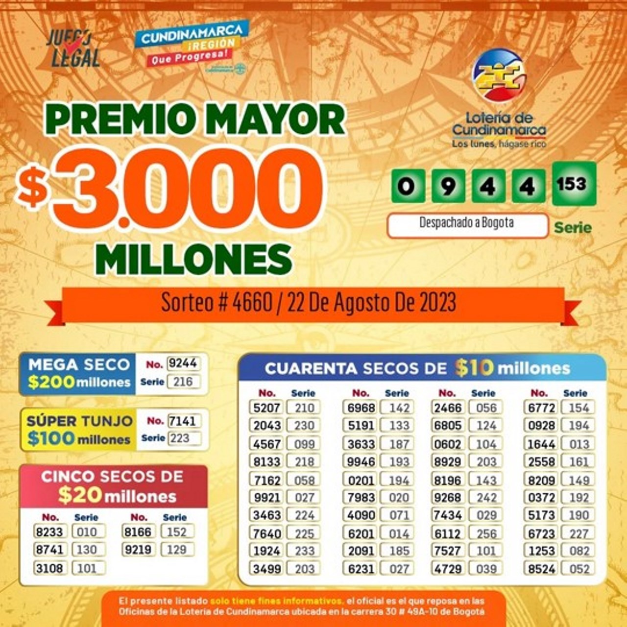 El número ganador del sorteo 4660 de la Lotería de Cundinamarca, jugado el 22 de agosto es… 0944, de la serie 153.
