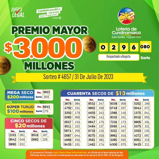 Minuto30.com .- La Lotería de Cundinamarca entrega cada lunes un multimillonario premio mayor de 3.000 millones de pesos a sus clientes.