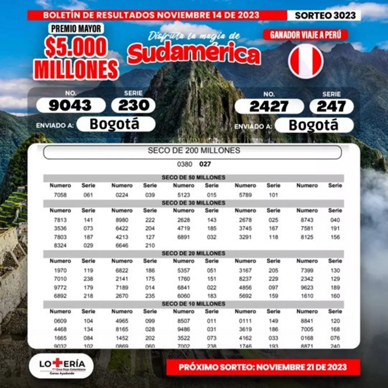 El número ganador del sorteo 3023 de la Lotería de la Cruz Roja, jugado el 14 de noviembre es… 9043 de la serie 230.