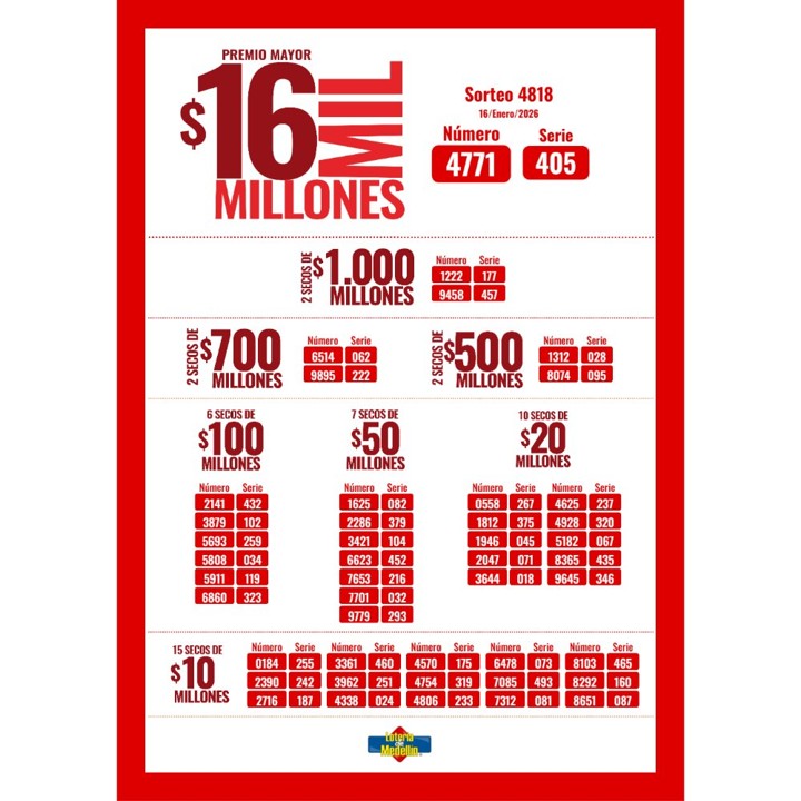 Minuto30.com .- . La noche de este viernes 16 de enero de 2026 la Lotería de Medellín volvió a rodar sus balotas, entregando la posibilidad de cambiarle la vida a un afortunado ganador con un premio mayor de 16 mil millones de pesos, correspondiente al sorteo 4818.