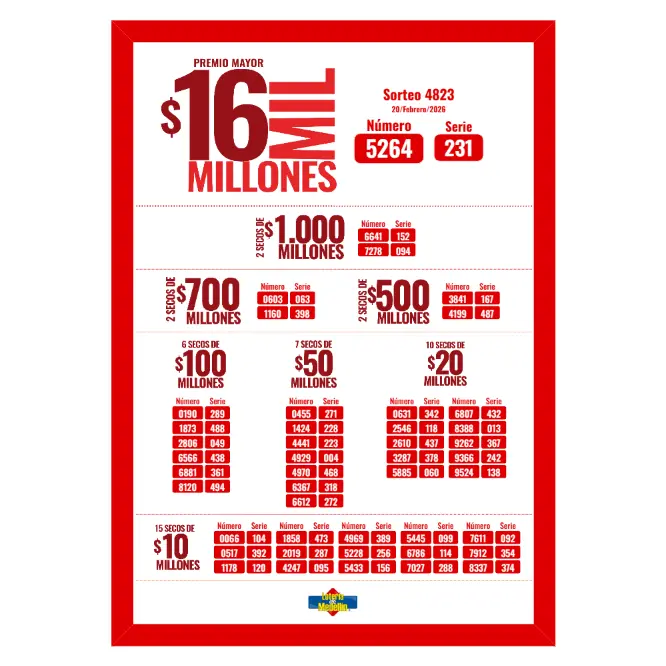 Minuto30.com .- . La noche de este viernes 20 de febrero de 2026 la Lotería de Medellín volvió a rodar sus balotas, entregando la posibilidad de cambiarle la vida a un afortunado ganador con un premio mayor de 16 mil millones de pesos, correspondiente al sorteo 4823.