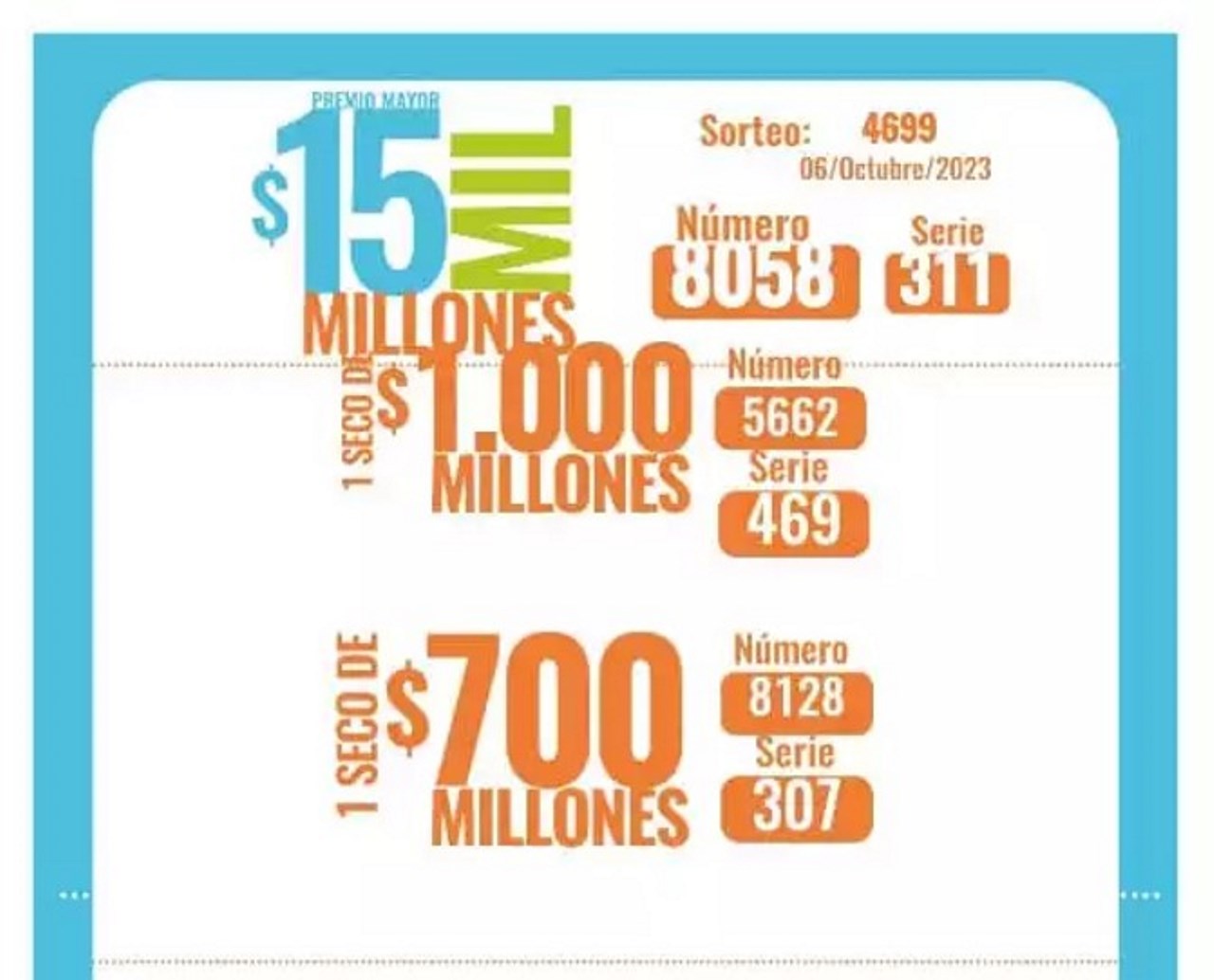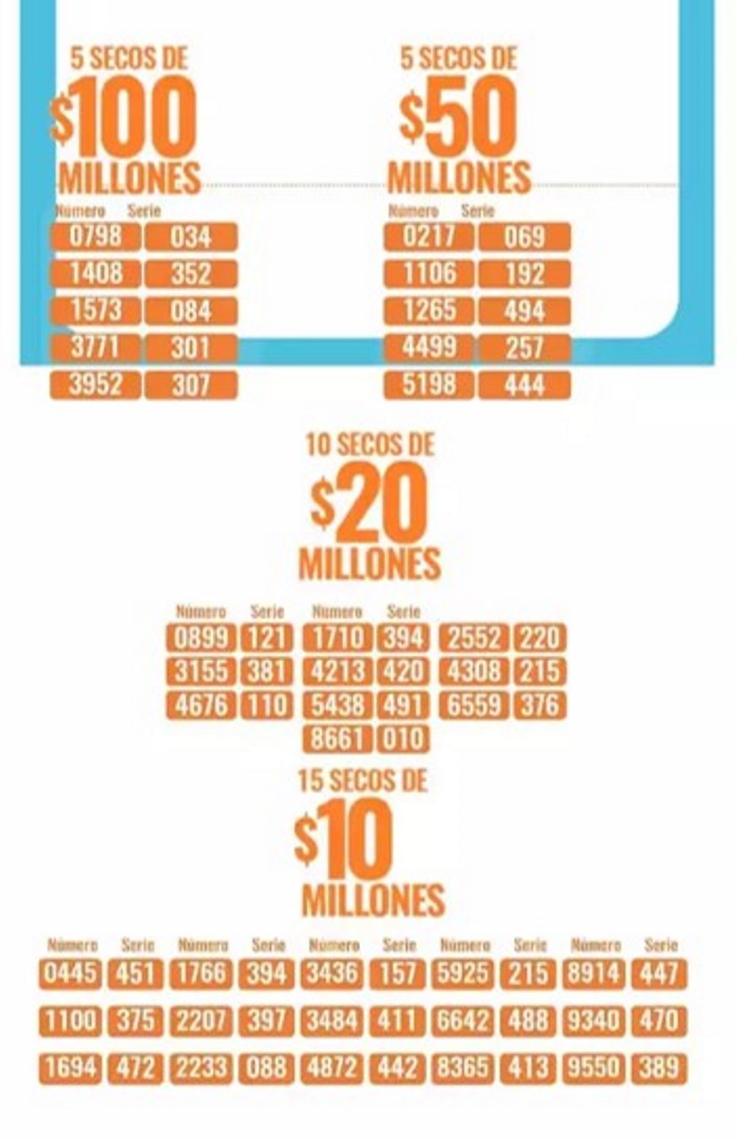 1 seco de 1.000 millones; otro de 700 millones; 5 seco de 100 millones; 5 secos de 50 millones; 10 de 20 millones y 15 secos de 10 millones son los otros premios que entrega el sorteo; además de las aproximaciones.