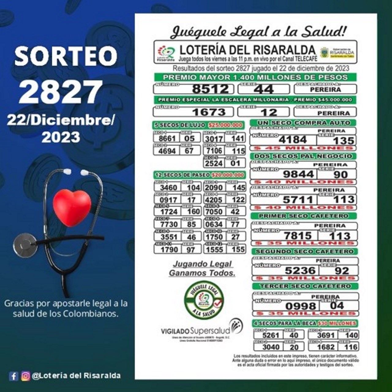 El número ganador del sorteo 2825 de la Lotería del Risaralda, jugado el 22 de diciembre es… 8512, de la serie 044.