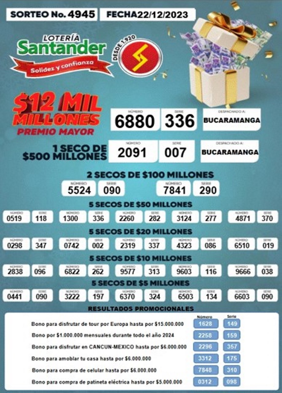 El número ganador del sorteo 4945 de la Lotería de Santander, jugado el 22 de diciembre es… 6880, de la serie 336.