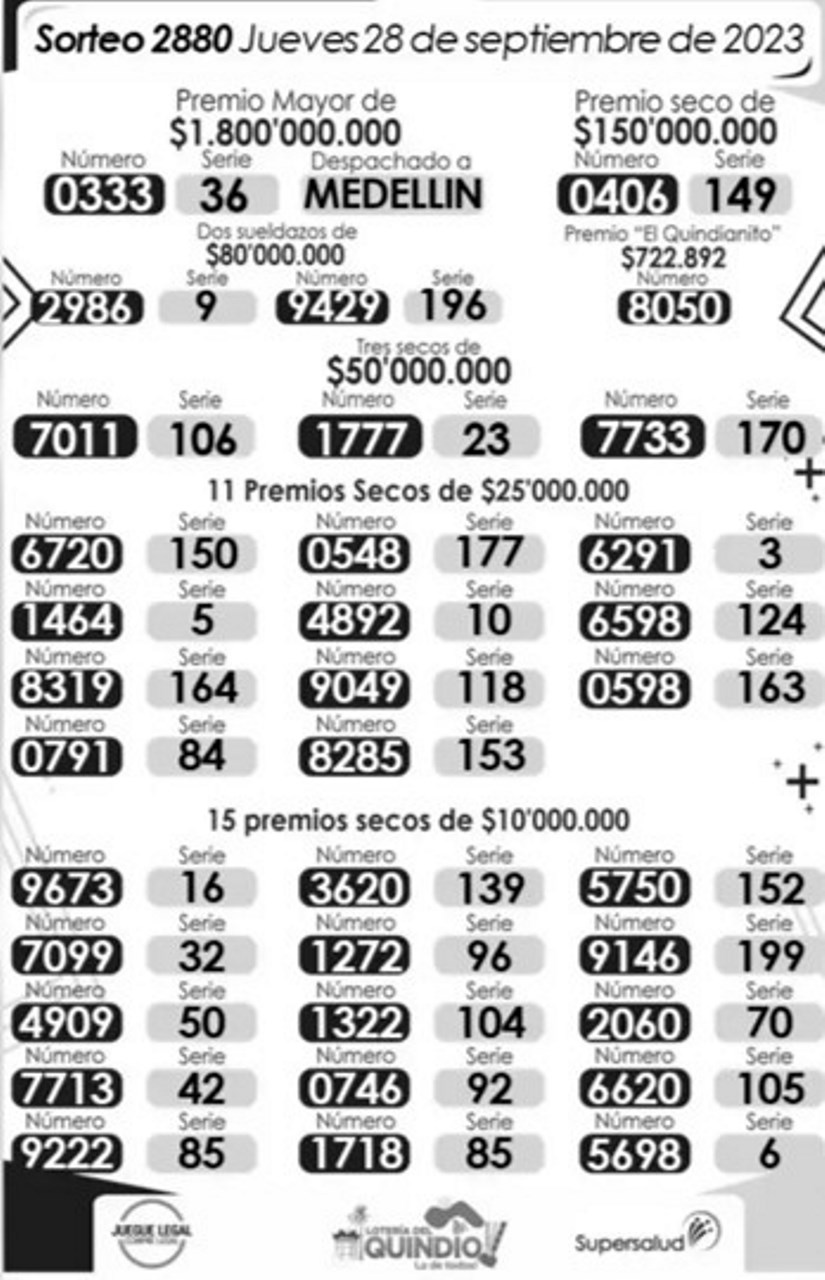 El número ganador del sorteo 2880 de la Lotería del Quindío, jugado el 28 de septiembre es… 0333, de la serie 036.