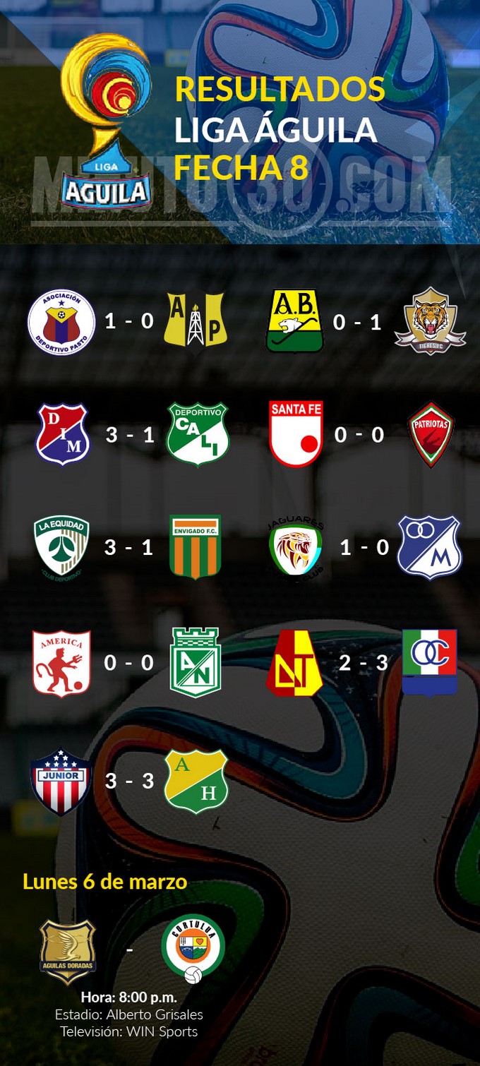 A falta de un partido, estos son los resultados de la fecha 8 de la Liga Águila I-2017, en la que Medellín conservó el liderato al encajar una importante victoria ante del Deportivo Cali.