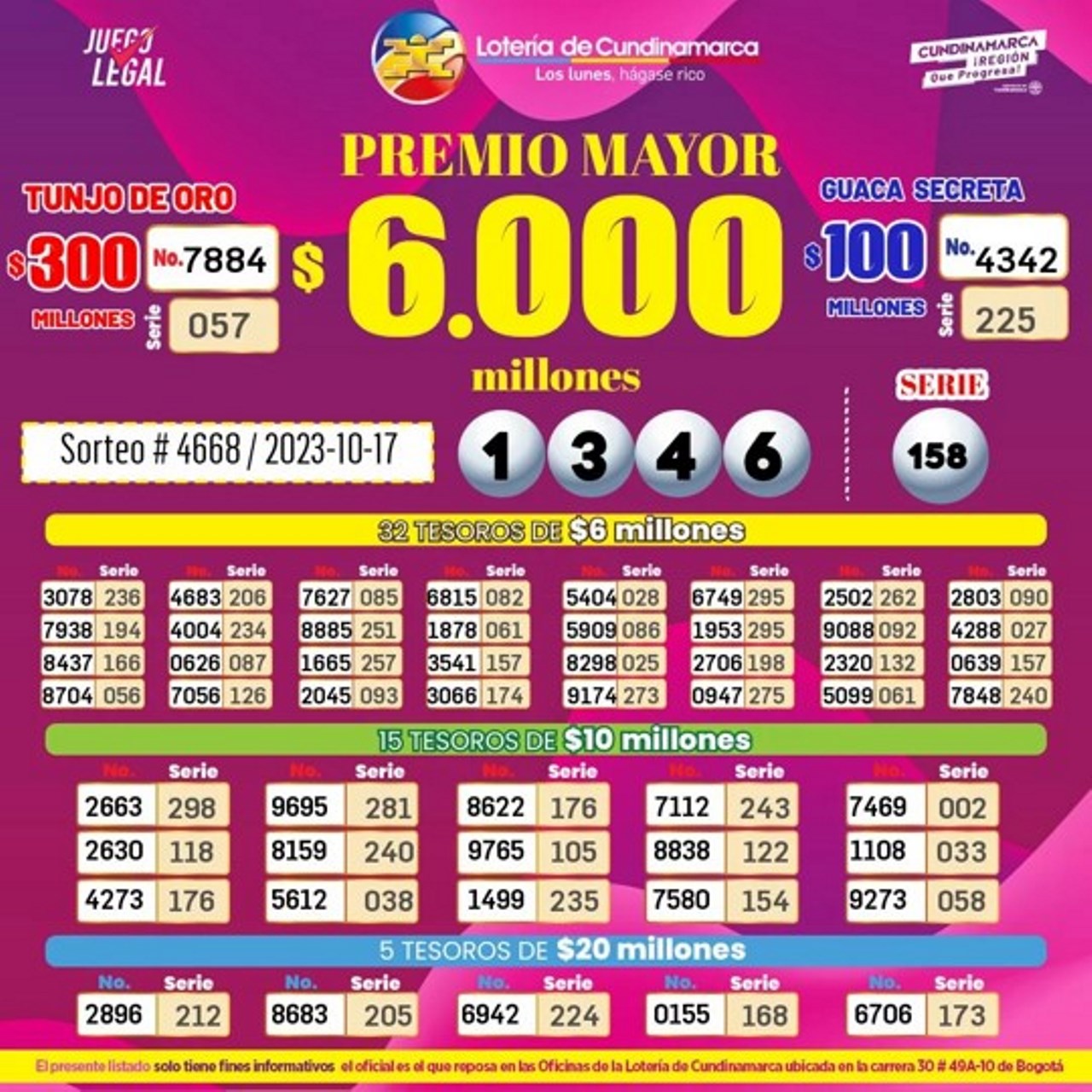 El número ganador del sorteo 4668 de la Lotería de Cundinamarca, jugado el 17 de octubre es… 1346, de la serie 158.