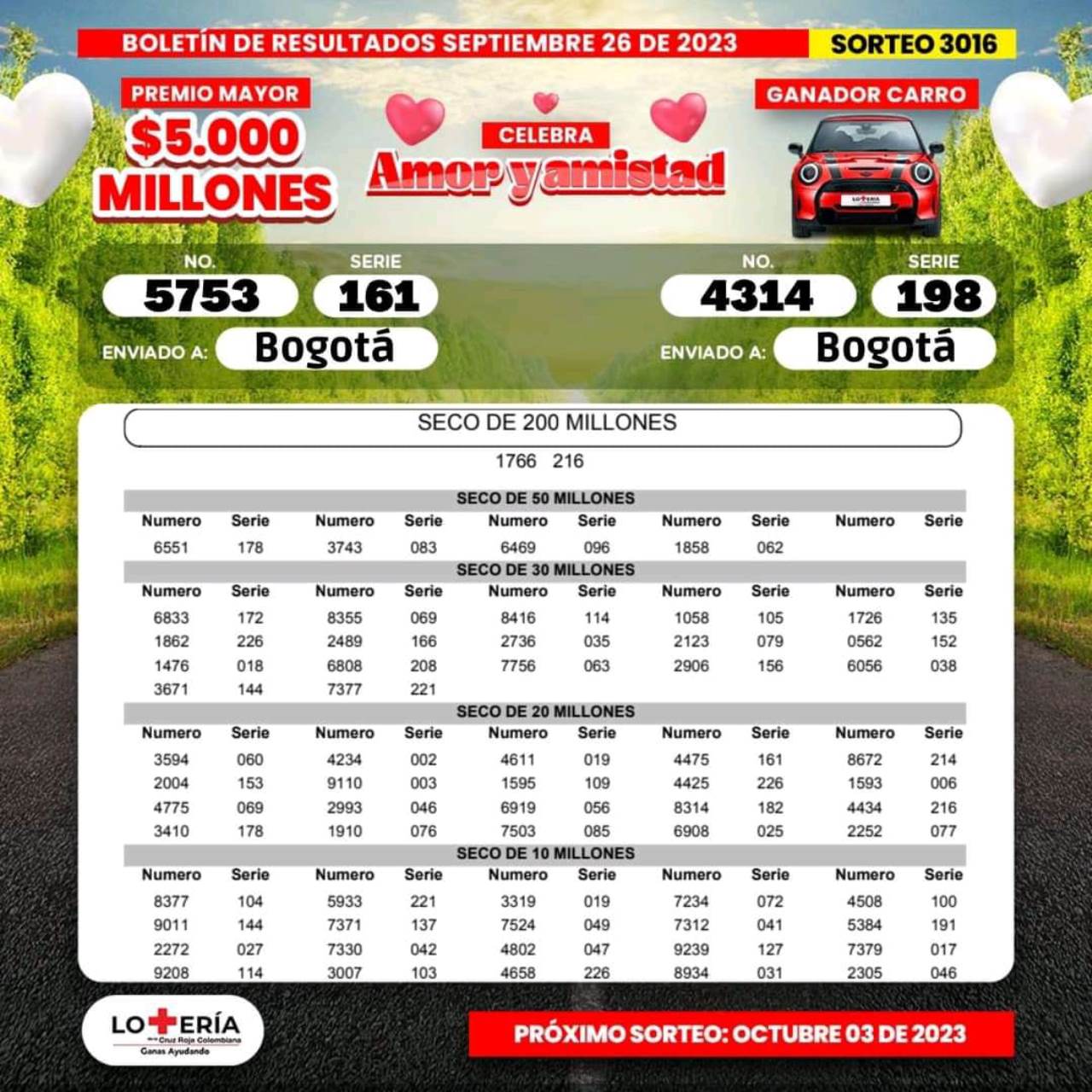 El número ganador del sorteo 3016 de la Lotería de la Cruz Roja, jugado el 26 de septiembre es… 5753 de la serie 161.