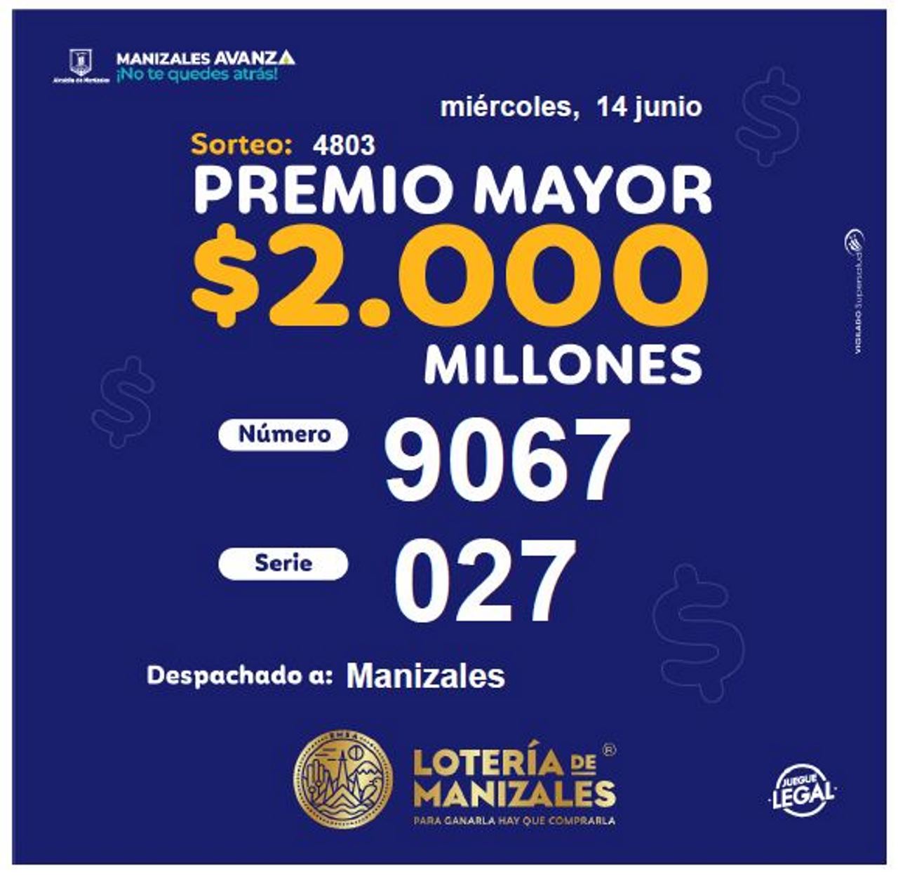 El número ganador del sorteo 4803 de la lotería de Manizales, jugado el 14 de junio es… 9067, de la serie 027