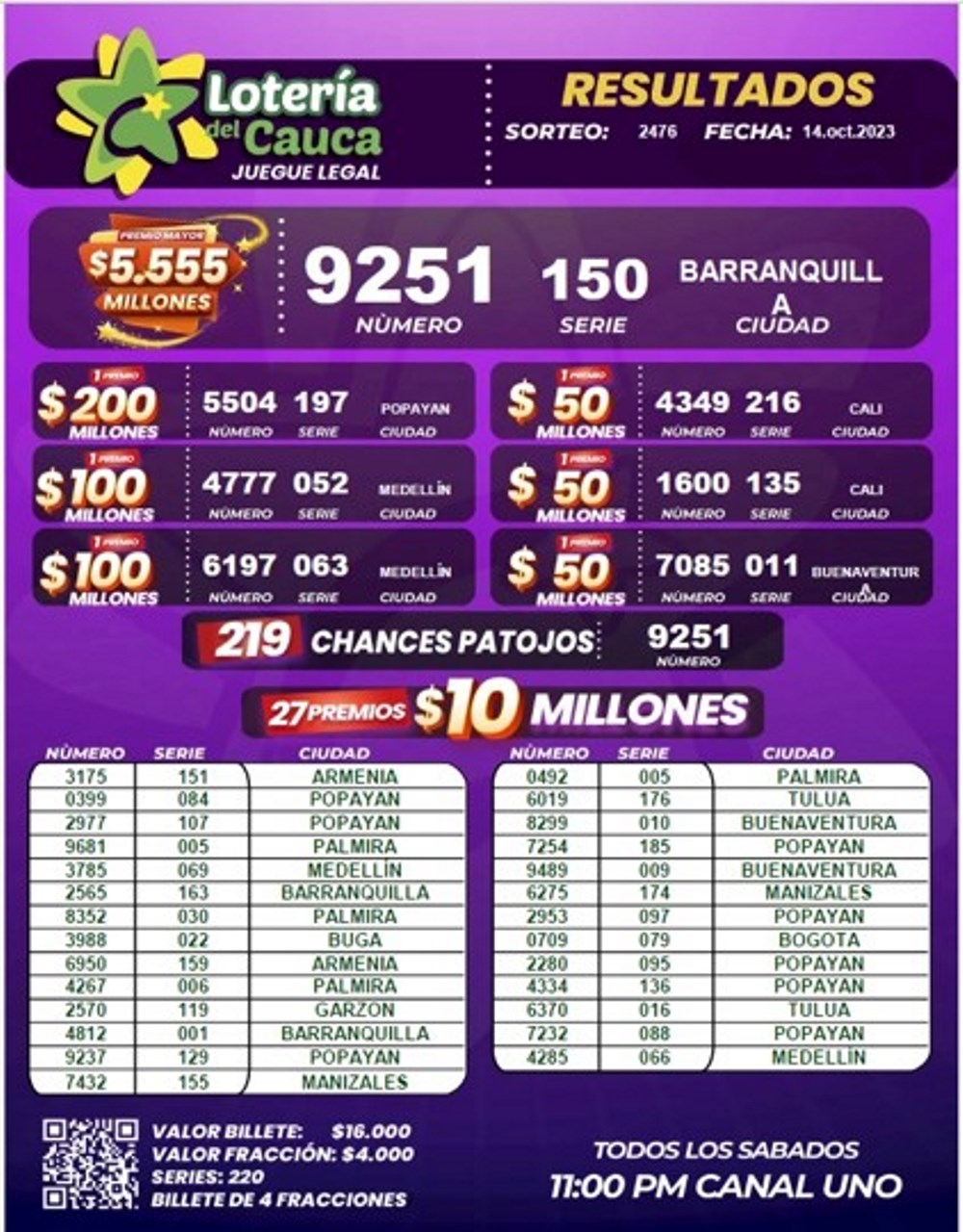 El número ganador del sorteo 2476 de la Lotería de Cauca, jugado el 14 de octubre es… 9251 de la serie 150..